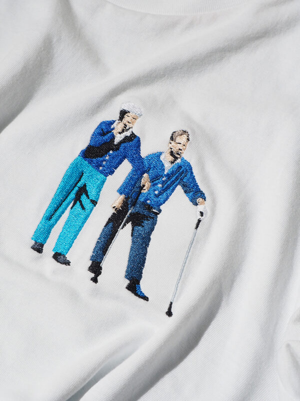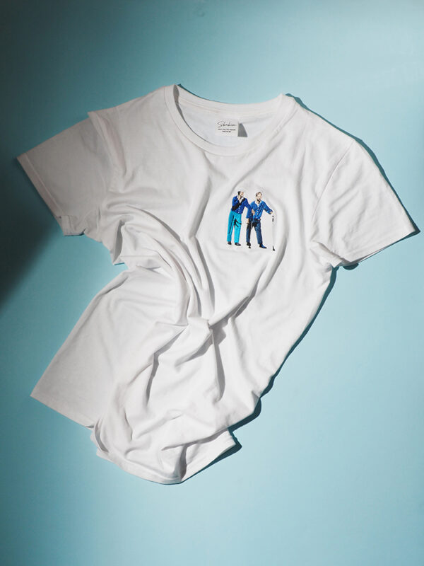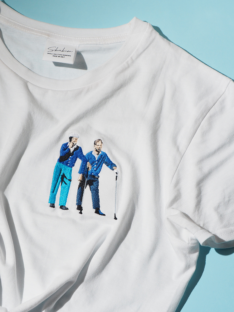 T-shirt in cotone 100% proveniente da agricoltura biologica ricamata con l’illustrazione di Arnold Palmer e Ben Hogan mentre, fumando, si apprestano a giocare il Masters Tournament di Augusta, Georgia nel 1966.
