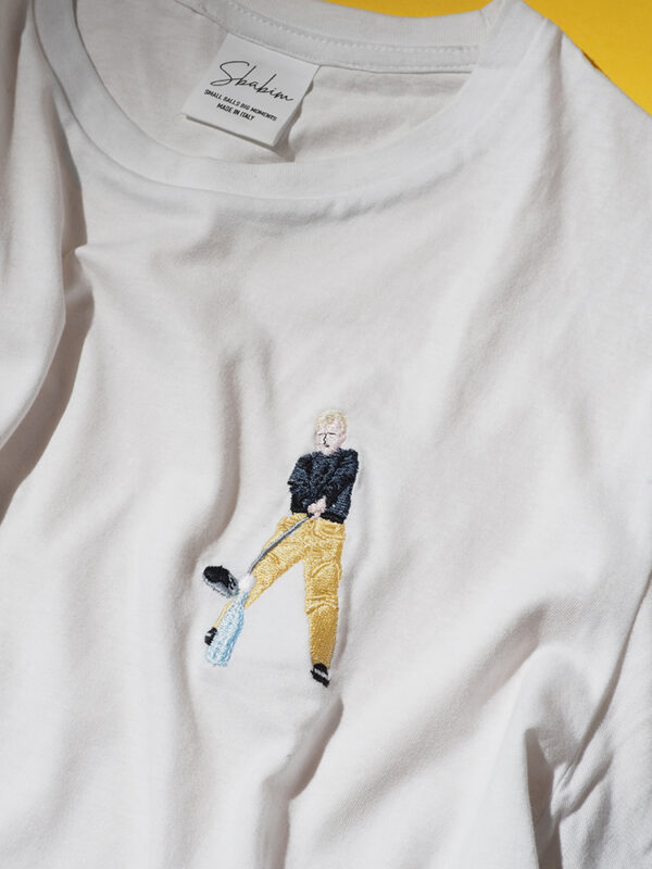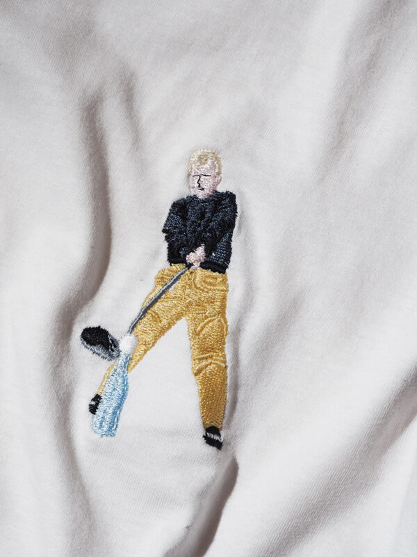 T-shirt in cotone 100% proveniente da agricoltura biologica ricamata con l’illustrazione di Moe Norman che colpisce una pallina da golf posizionata su una bottiglia di Coca Cola.
